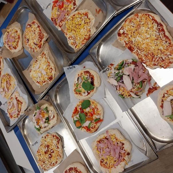 The primary schoolchildren washed their hands and rolled up their sleeves to start their pizza preparation. They rolled...